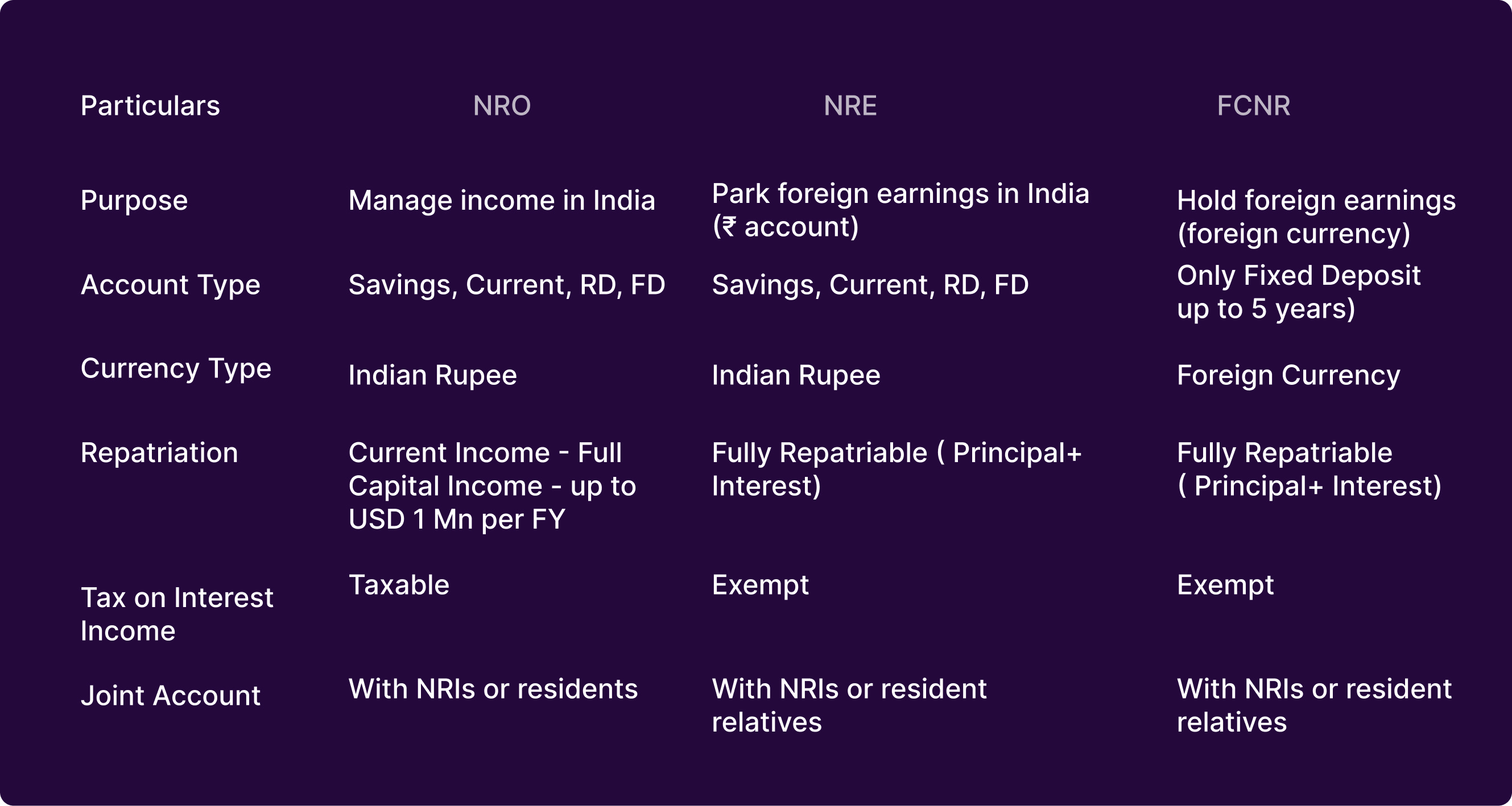 Breaking down NRE, NRO, and FCNR accounts for NRIs.