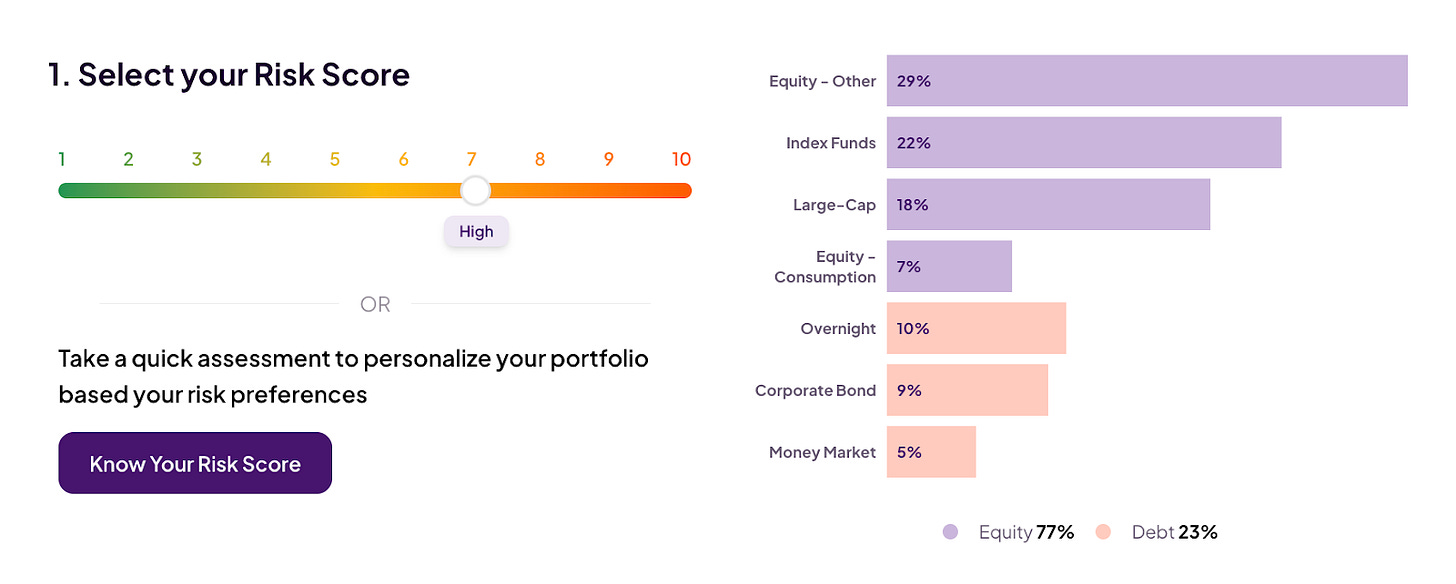 The risk score system ensures that every portfolio is aligned with your risk tolerance. Whether you want to be aggressive or conservative, the tool curates the fund recommendations to suit your personal risk appetite.