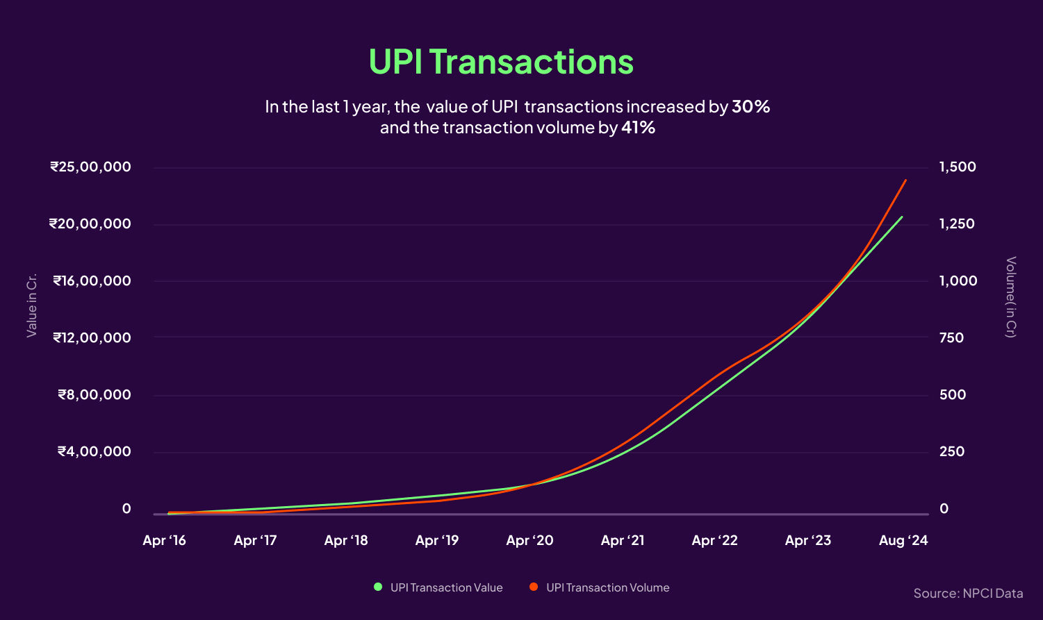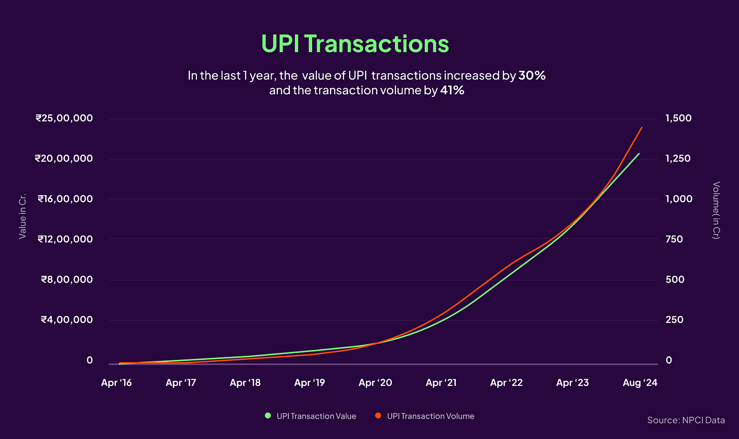 In August 2024, the number of UPI transactions equaled 14,963.05 million, a 41% increase from the previous year. And, The value of transactions stood at Rs 20.6 lakh crore, a 30% increase year on year.